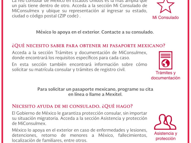 Conecta de manera directa e inmediata a los mexicanos con su consulado más cercano y permite obtener citas vía internet o teléfono. Además, contiene información sobre temas clave de actualidad migratoria, como la política federal estadounidense de “acción diferida”.