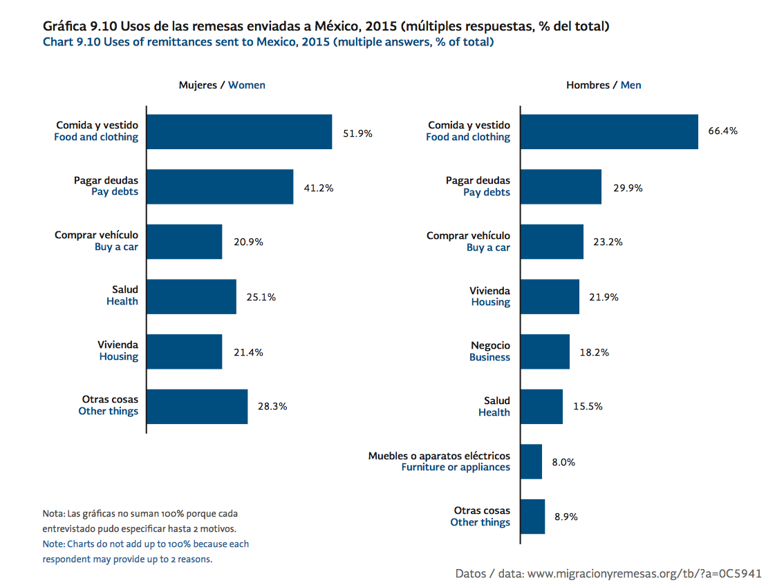 - Las principales razones por las que los migrante envían remesas a México es para comida y vestido y el pago de deudas, comprar un auto, salud y vivienda.
