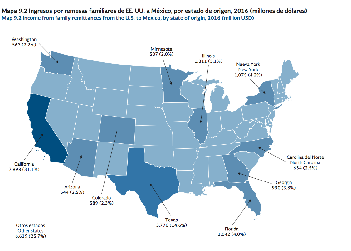 - California y Texas son los principales estados de donde provinieron las remesas a México en 2016. Le siguieron Illinois, Nueva York, Florida y Georgia.