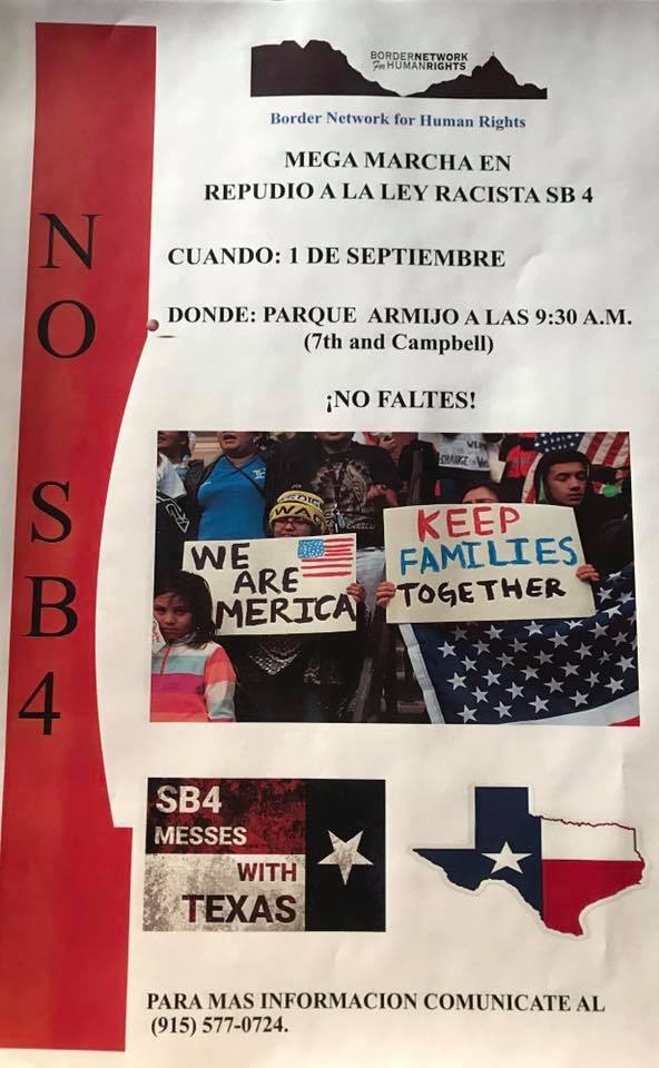 La Red Fronteriza para los Derechos Humanos (BNHR) ha hecho una llamado a toda la comunidad migrante de Texas a participar este 1 de septiembre en la ‘Gran Marcha contra la SB4‘ para exigir que los líderes políticos adopten medidas de “inclusión y diversidad”, y no de discriminación contra los inmigrantes.