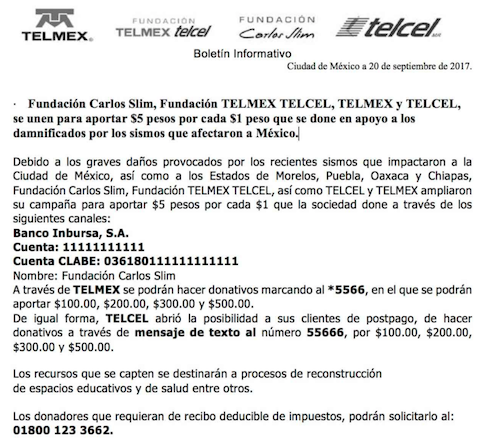 Carlos Slim, a través de su fundación dará 5 pesos por cada pesos que las personas aporten, lo cual quintuplica los apoyos para las zonas más devastadas por los sismos.