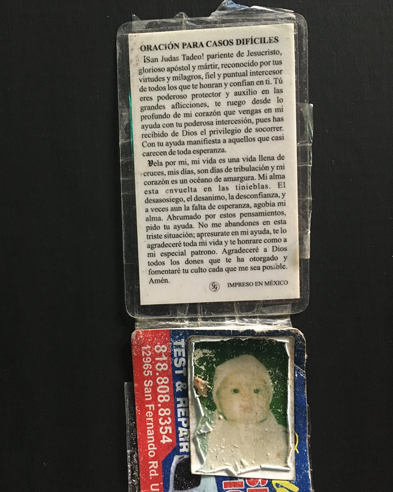 Una imagen de San Judas con una oración para tiempos difíciles y la imagen de su familia, muchos migrantes solo parten con esas cosas en su bolsillo en la búsqueda del sueño americano