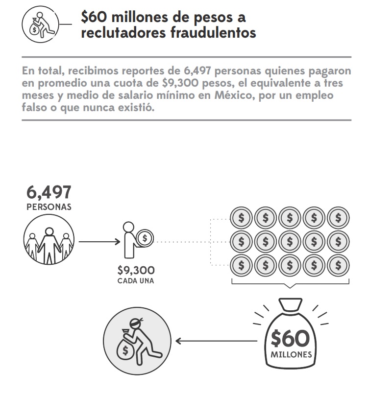 Cada persona que buscaba empleo pagó en promedio 9 mil 300 pesos por trabajos que no existían. En total, las y los posibles trabajadores migrantes han sido estafados por la asombrosa cifra de $60 millones de pesos.