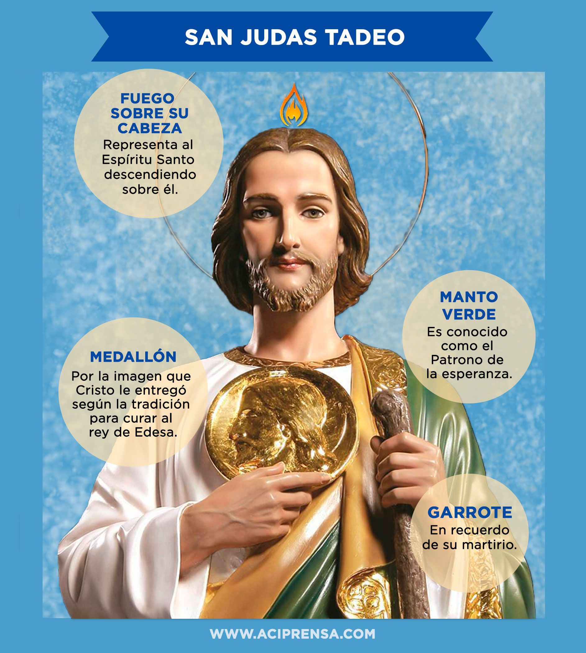 La prenda de color verde que el santo San Judas Tadeo viste representa la esperanza y la renovación.