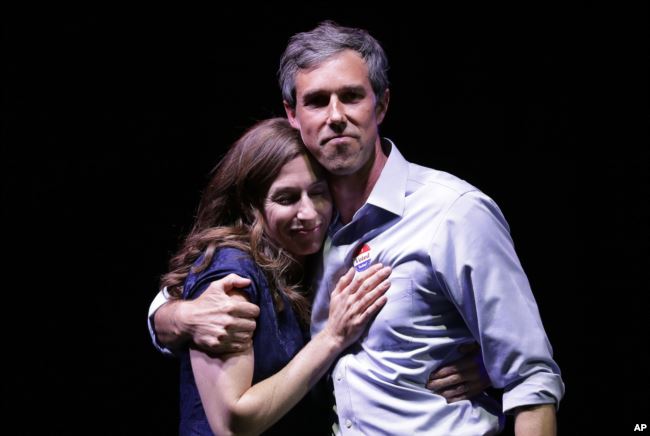 Beto O’Rourke, candidato demócrata al Senado de EE.UU. por Texas, que fue derrotado por el actual senador Ted Cruz, es visto junto a su esposa, Amy Sanders, durante la noche de la elección el martes, 6 de noviembre de 2018, en El Paso, Texas.