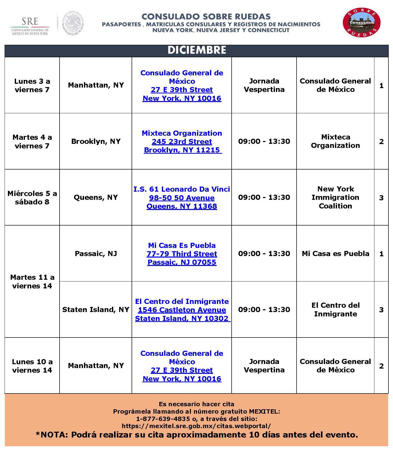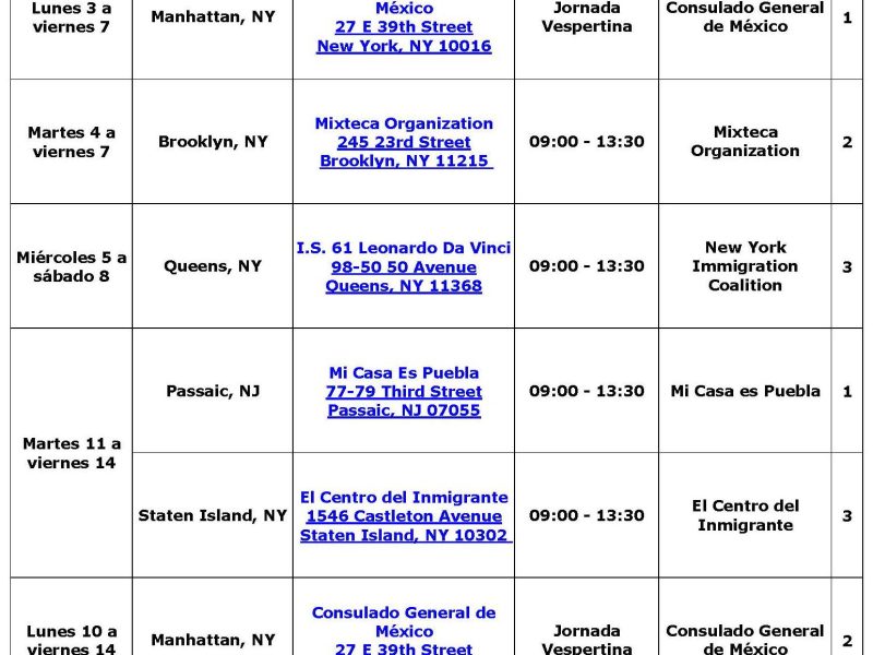 DICIEMBRE 2018 | Fechas y horarios del consulado sobre ruedas en Nueva York, NJ y Connecticut