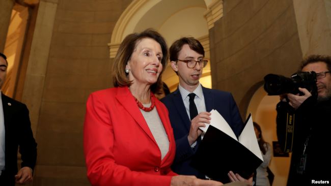 Nancy Pelosi habla con un asistente cuando se dirige a un evento que promueve la “Ley de Aumento del Salario” y un salario mínimo nacional de $ 15 por hora poco después de pedirle al Presidente Donald Trump que demore el discurso sobre el Estado de la Unión.