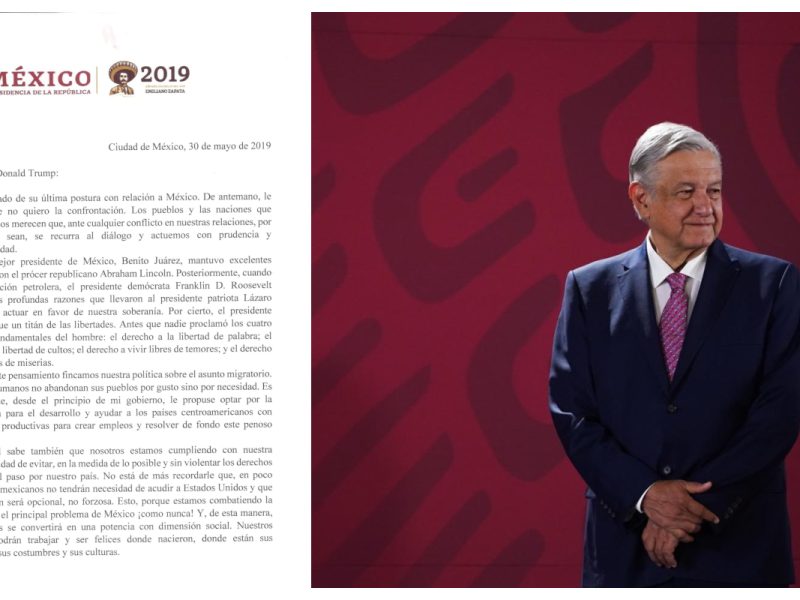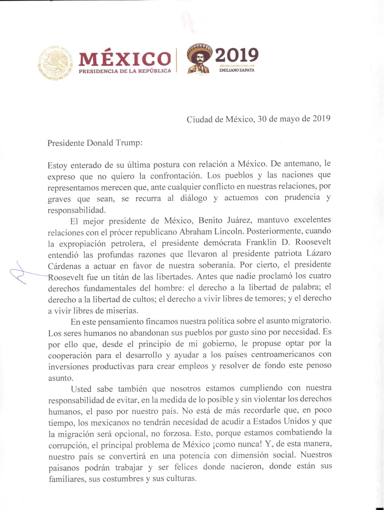 El presidente Andrés Manuel López Obrador dirigió una carta a Donald Trump, donde pide profundizar el diálogo para buscar alternativas al problema migratorio, luego de que el presidente estadounidense anunciara aranceles como castigo por el flujo de migrantes que llegan a EU.