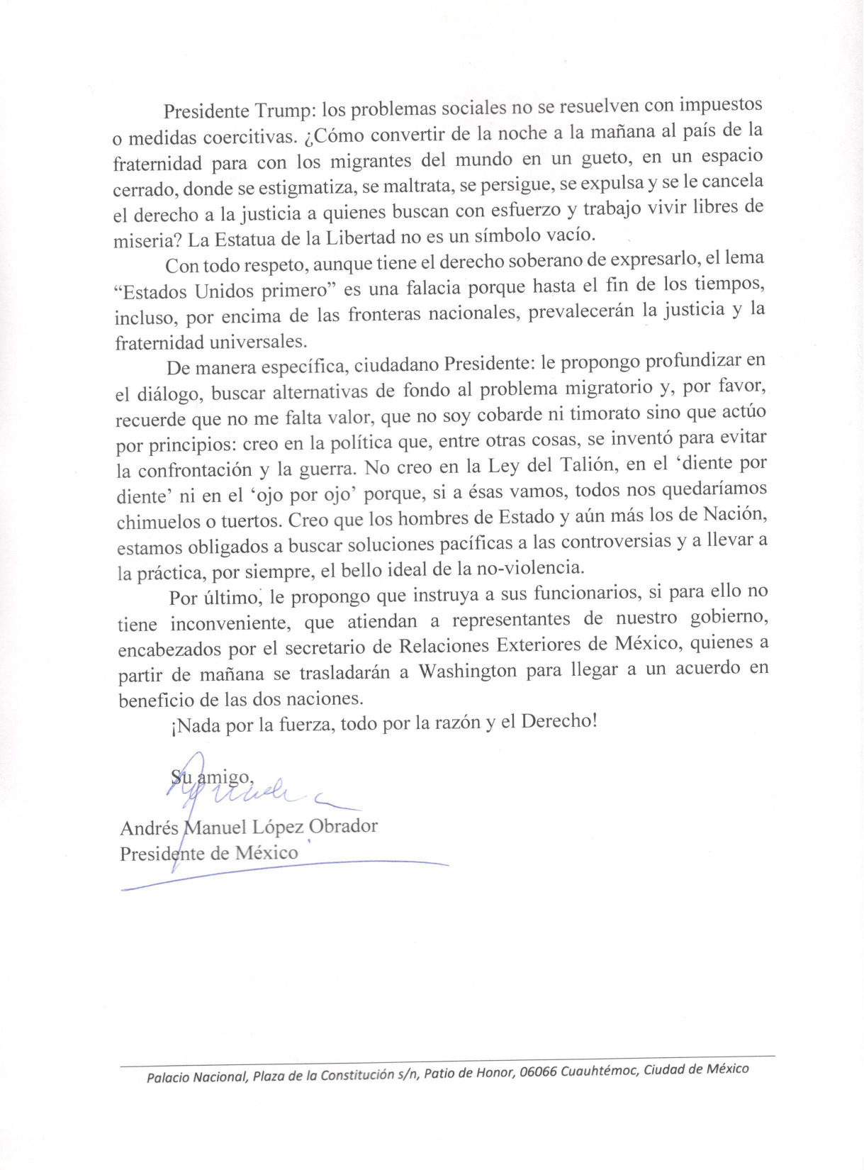La carta fue publicada en su cuenta oficial de Twitter con el comentario “al presidente Donald Trump en son de paz”, López Obrador subrayó que “los problemas sociales no se resuelven con impuestos o medidas coercitivas”.