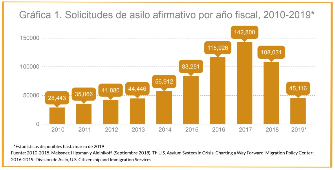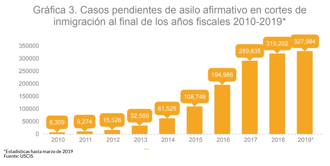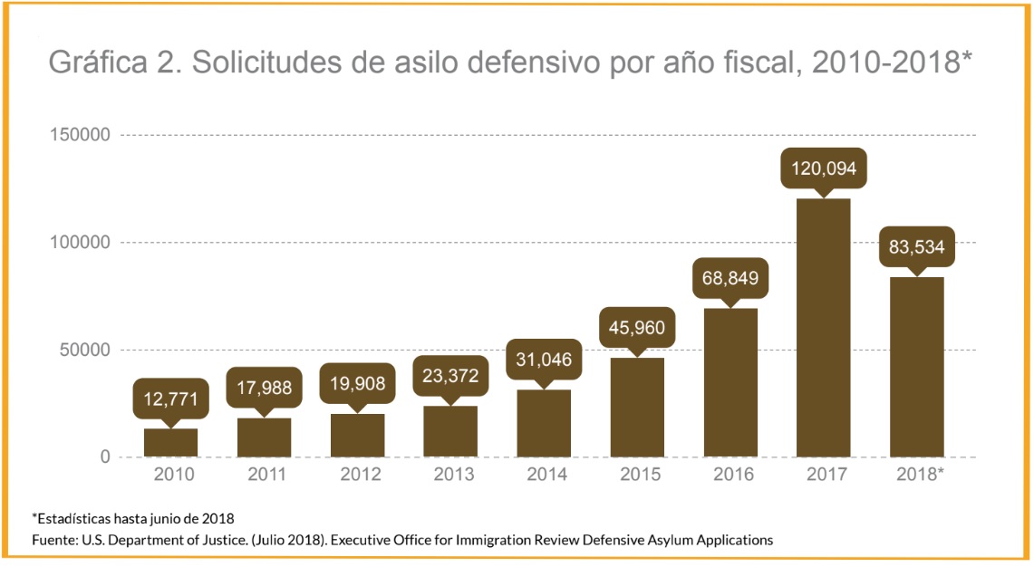 El número de solicitudes de asilo afirmativo aumentó rápidamente durante los últimos años; pasó de 28 mil 443 casos en el año fiscal 2010 a 142 mil 800 en el año fiscal 2017.