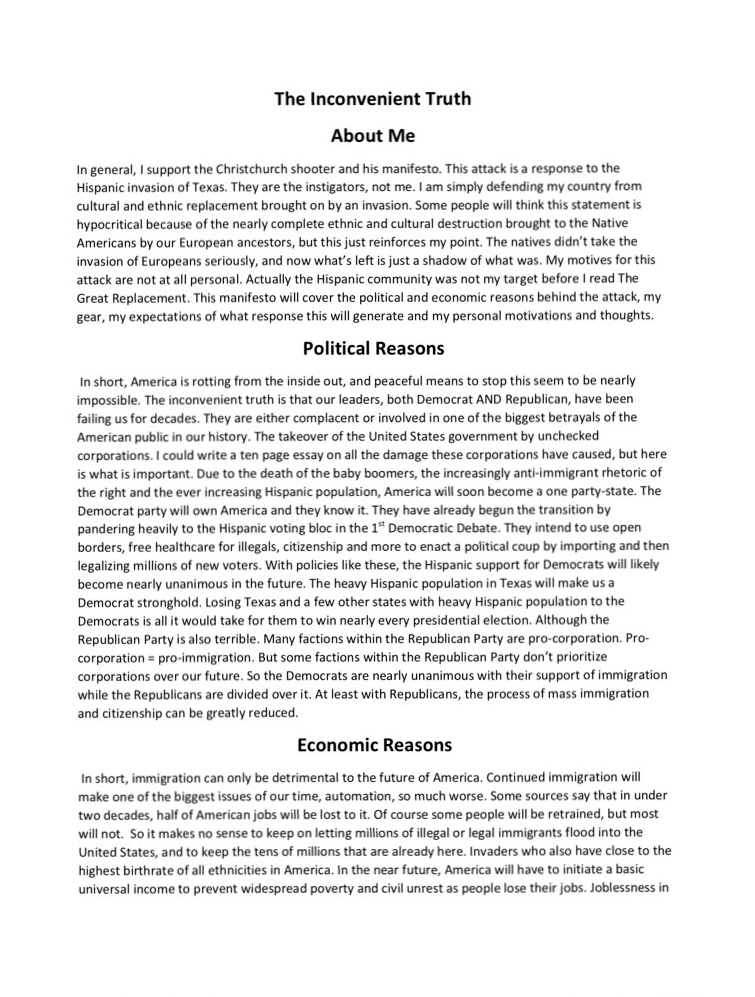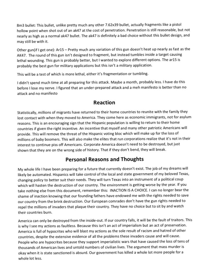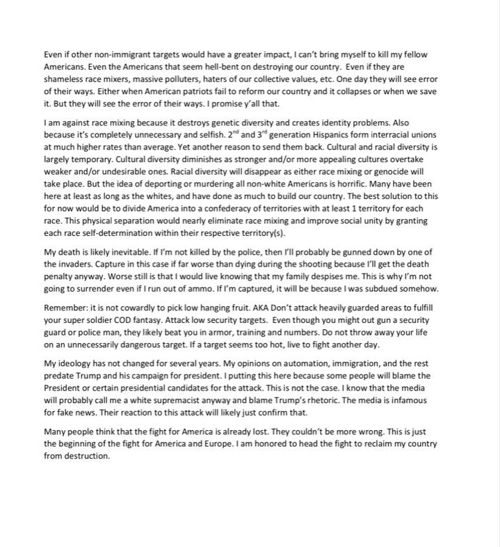 Una hora antes del incidente, el asesino publicó un manifiesto anti-migración, que demuestran que el tiroteo fue un acto de terrorismo.
