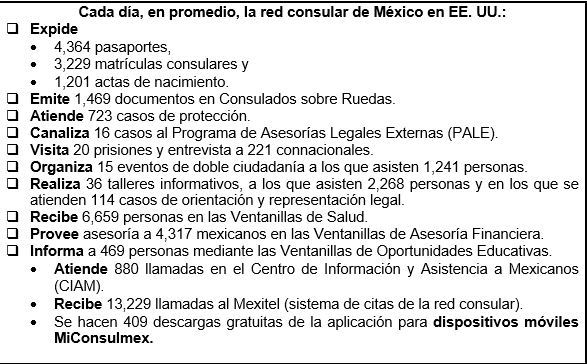 La secretaria también dio a conocer el promedio que cada día los consulados realizan trámites o atiende a personas: