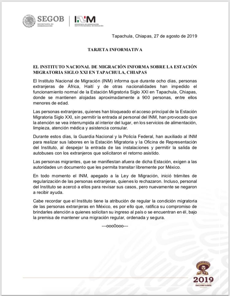 Mediante un comunicado, el INM informó que en los últimos ocho días alrededor de 900 personas que incluyen niños, provenientes principalmente de África y Haití han bloqueado el acceso principal a dicha estación sin permitir la entrada al personal lo que ha provocado la interrupción al interior de servicios de alimentación, limpieza, atención médica y asistencia consular.