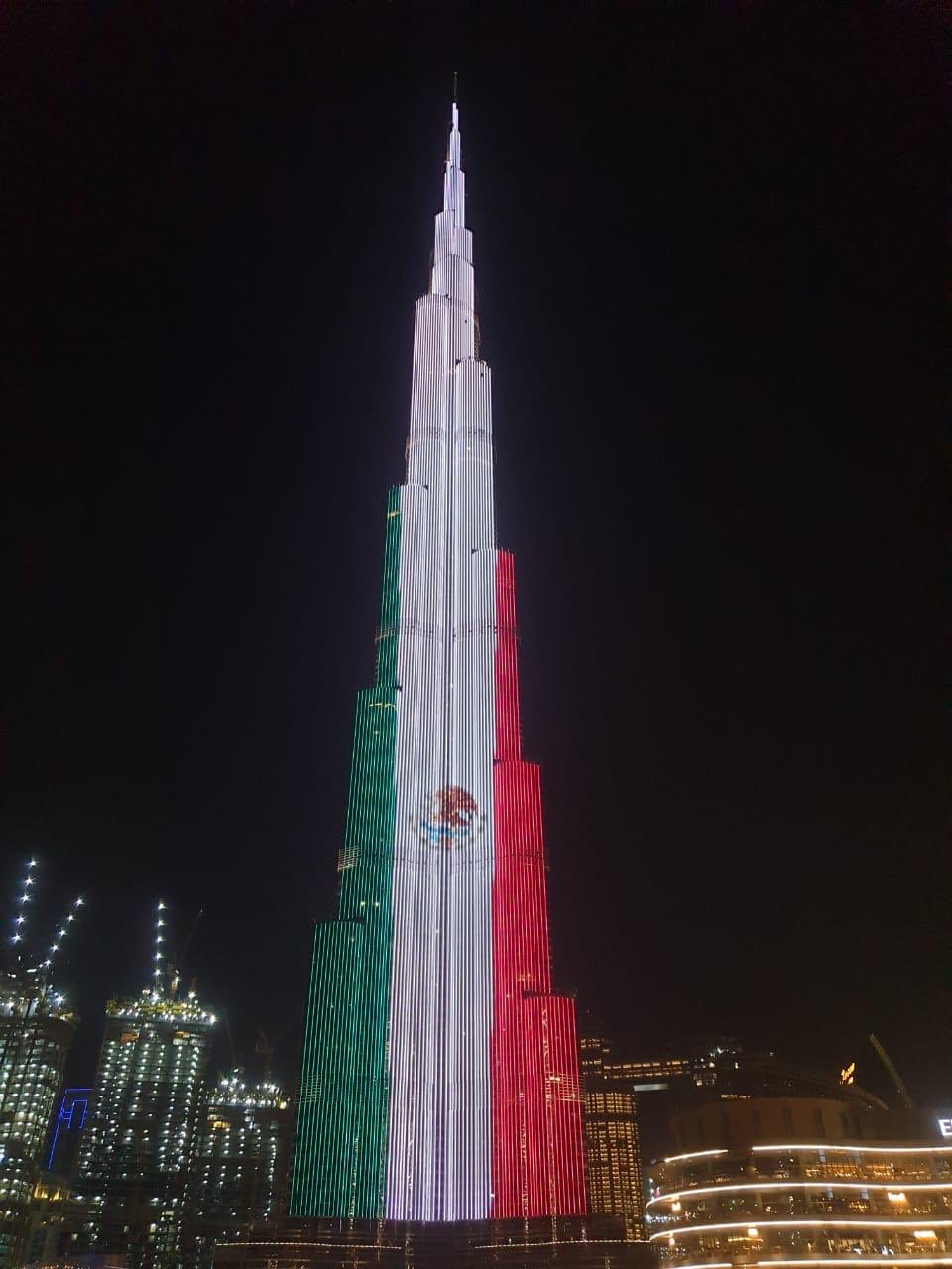 El emblemático Burj Khalifa en Dubai, se iluminó con los colores de la bandera en las celebración del 15 de septiembre.