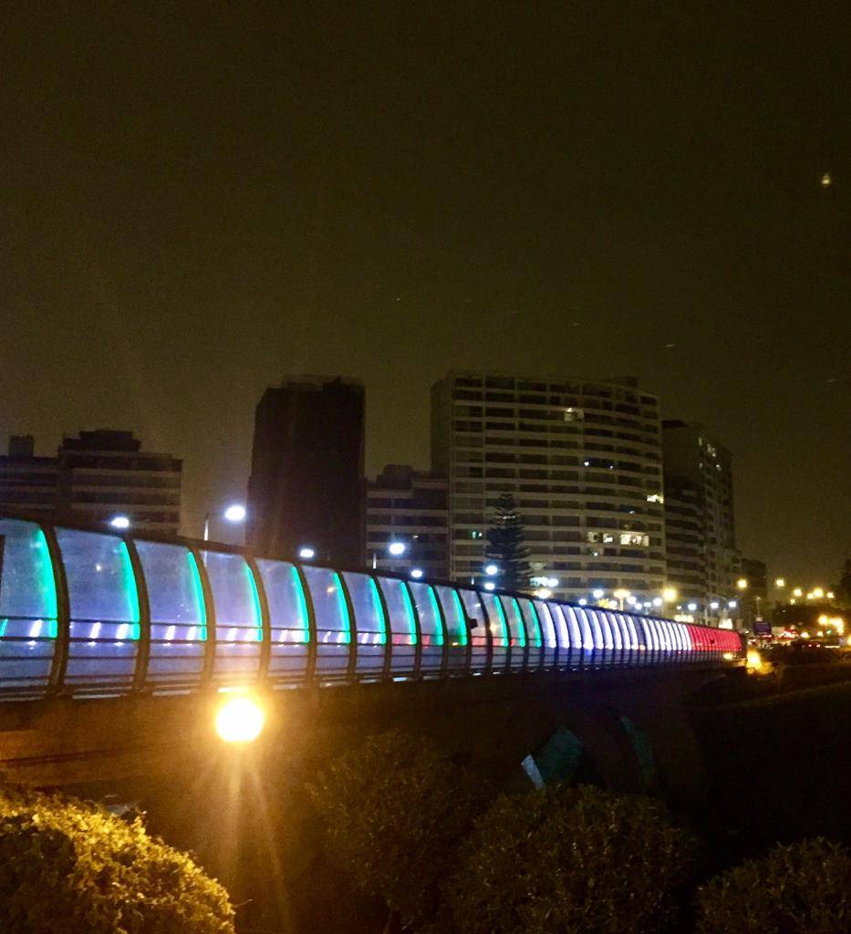 El puente Villena de Miraflores, Perú, se iluminó esa noche con los colores de México en homenaje a su independencia.