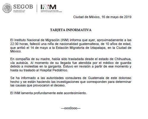 En su momento, el INM dijo que la niña había fallecido como consecuencia de un malestar en su garganta, por lo que fue atendida y trasladada al Hospital Pediátrico, en donde falleció a las 22:30 horas.