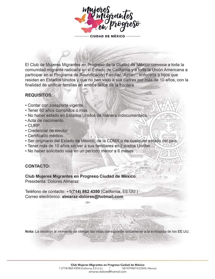 El Programa de Reunificación Aztlán es creado por la organización sin fines de lucro “Mujeres Migrantes en Progreso”, la cual tiene experiencia en ayudar a la comunidad migrante y a las familias más vulnerables