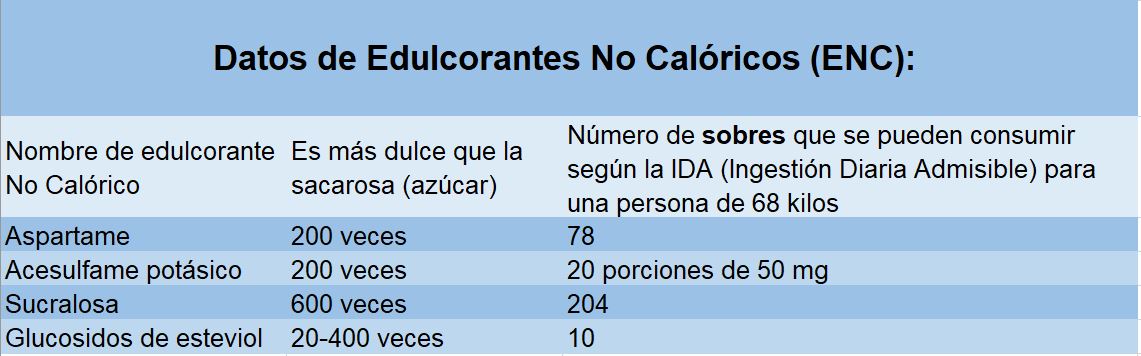 Los ENC son sustancias que se añaden a las bebidas y alimentos para dar un sabor dulce con nulo o mínimo aporte de calorías.