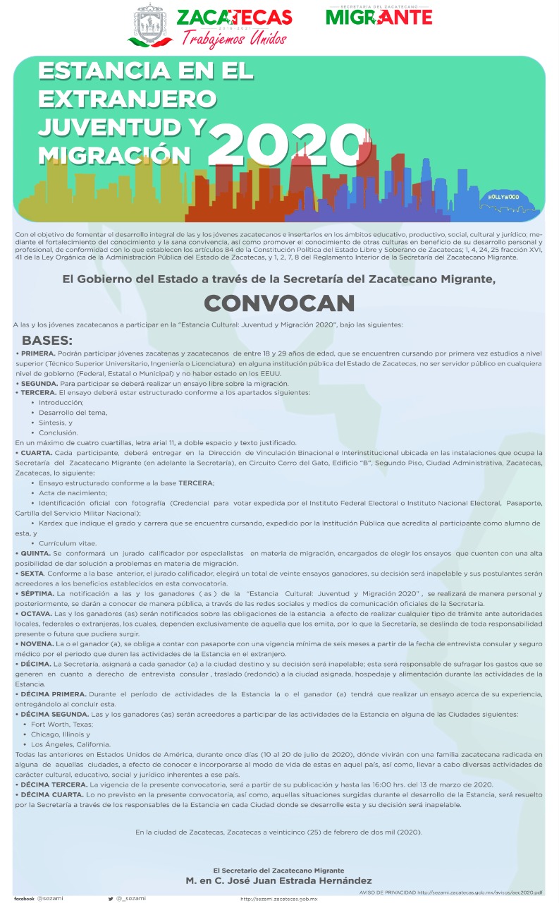 La Secretaría del Zacatecano Migrante (Sezami) ofrece, a jóvenes estudiantes del estado que cursen el nivel superior, la posibilidad de realizar una estancia cultural en Estados Unidos, gracias a una beca subsidiada en su totalidad por el Gobierno de Alejandro Tello.