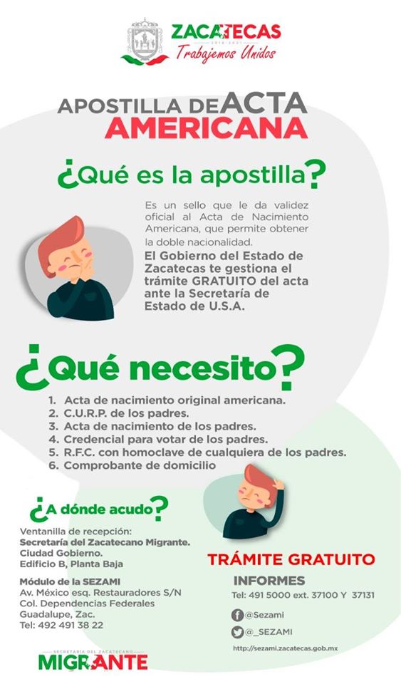 Debido a la contingencia sanitaria, se suspendieron varios servicios en Zacatecas y Estados Unidos. El trámite de 140 solicitudes de apostille de actas americanas y doble ciudadanía que recibió la Secretaría del Zacatecano Migrante (Sezami) se aplazará unos meses.