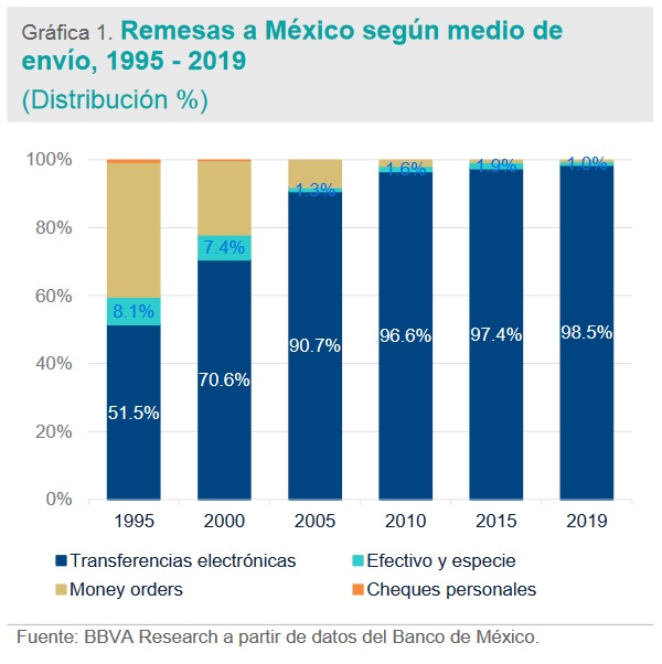 De acuerdo con el banco, en los primeros 10 meses de 2020 el 99% del envío de remesas ha sido a través de transferencias electrónicas.