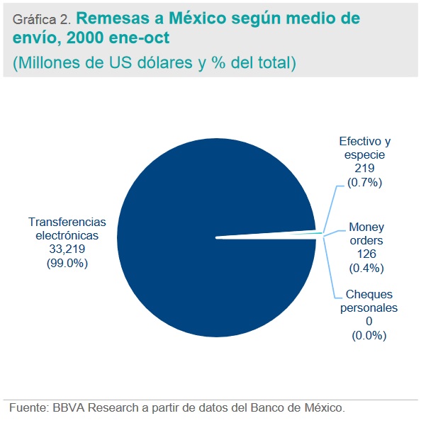 Tan sólo en los primeros diez meses de 2020, 99.0% de las remesas que llegaron a México fueron por transferencias electrónicas.