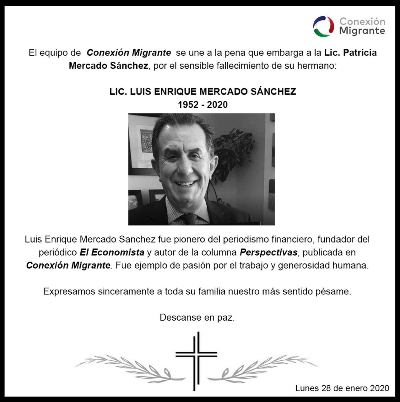 Luis Enrique Mercado Sánchez, pilar del periodismo mexicano moderno y pionero del periodismo financiero, falleció este lunes 28 de diciembre.