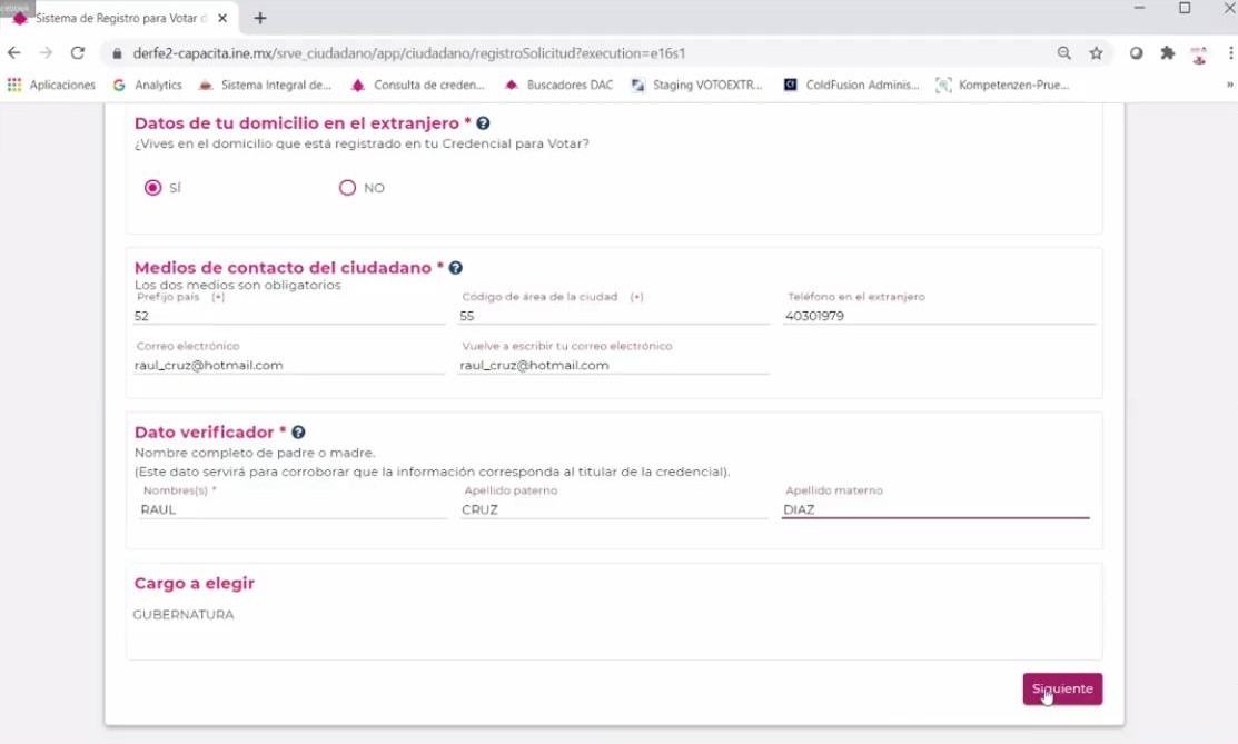 Te pedirán que ingreses tus medios de contacto. En la parte de dato verificador debes colocar el nombre completo de tu padre o madres y luego seleccionar el cargo a elegir. Continúa.