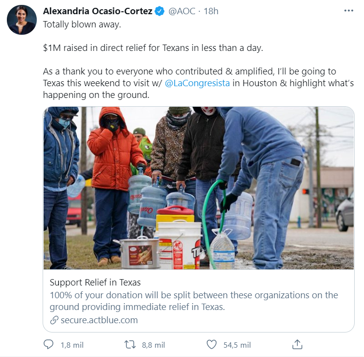 Alexandria Ocasio decidió hacer esta recaudación de dinero debido a la crisis que están enfrentando millones de tejanos. Y es que el estado se ha visto fuertemente afectado por una tormenta invernal histórica. Hasta el momento, esta tormenta ya dejó cerca de 50 personas muertas en todo Estados Unidos y millones de hogares sin electricidad y sin agua.
