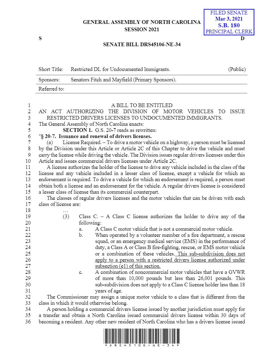 La Propuesta SB 180, titulada “Licencias de conducir restringidas para inmigrantes indocumentados” tiene como autores a los senadores de Carolina del Norte Milton F. “Toby” Fitch, Jr. (Edgecombe) y Julie Mayfield (Buncombe).