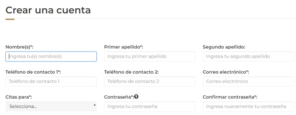 Un vez que seleccionaste el tipo de cita que requieres, debes ingresar una contraseña y confirmarla. Recuerda anotarla en algún lugar que no la olvides. La contraseña debe tener por lo menos una letra mayúscula y números, de preferencia.