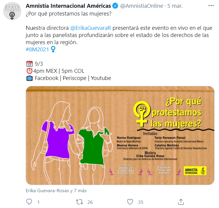 Para este lunes está previsto un evento organizado por Aministía Internacional. En él participará la directora Erika Guevara, entre otras personas. Los panelistas profundizarán sobre el estado de los derechos de las mujeres en la región durante el evento en vivo.