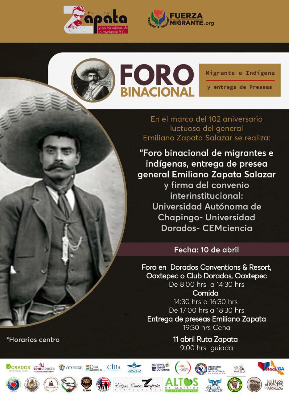 Este año se conmemora el 102 aniversario luctuoso del general Emiliano Zapata. Por ello, la Fundación Zapata, Héroes de la Revolución A.C. y Fuerza Migrante han organizado el Foro Binacional Migrante e Indígena.