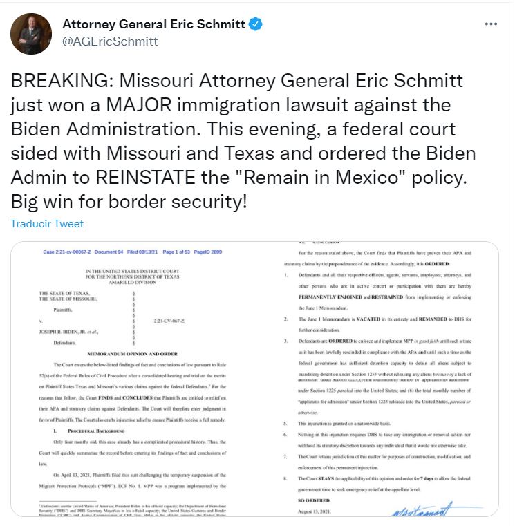 In April, along with @TXAG, we fought for border security and sued the Biden Administration for cancelling the successful Trump-era “Remain in Mexico” policy. Today, WE WON. The Biden Admin will be required to reinstate the policy.