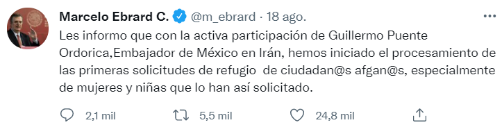 El canciller mexicano Marcelo Ebrard confirmó esta información a través de su cuenta de Twitter. En su publicación, Ebrard aclaró que los trámites se están realizando gracias a la colaboración del Embajador de México en Irán.