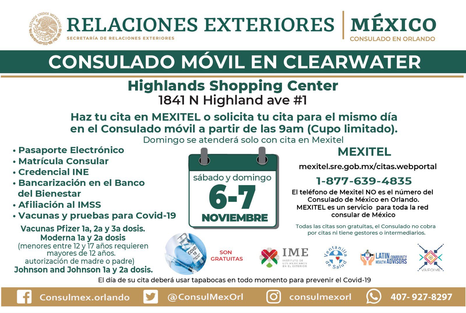 El Consulado de México en Orlando anunció las fechas y lugares que visitará en su consulado sobre ruedas durante el mes de noviembre de 2021, además, confirmó que tendrá jornadas sabatinas en el mes.