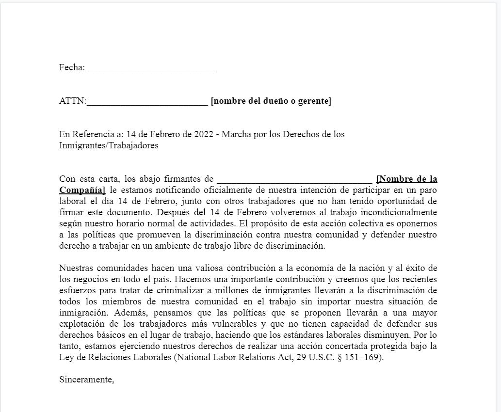 ¿Quieres participar en Un Día sin Inmigrantes? Entrega esta carta a tu patrón