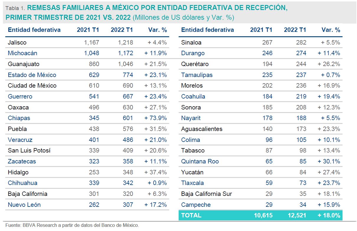 A través de su más reciente análisis de migración y remesas, BBVA Research detalló que Jalisco es el principal receptor de remesas de México; entre enero y marzo de 2022, el estado recibió mil 218 millones de dólares.