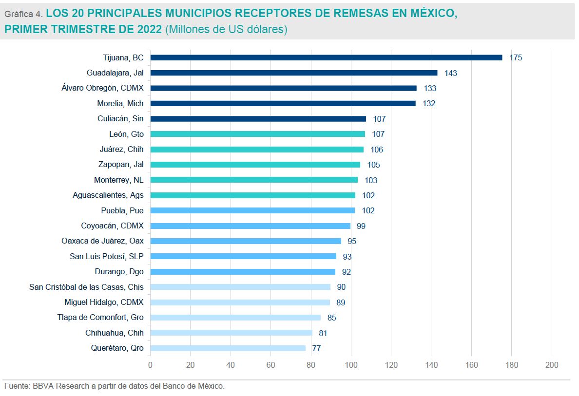 En cuanto a los municipios que recibieron más dinero, Tijuana, en Baja California, se mantiene como el municipio que recibe más remesas a nivel municipal. Durante el primer trimestre de 2022 el municipio recibió 175 millones de dólares.