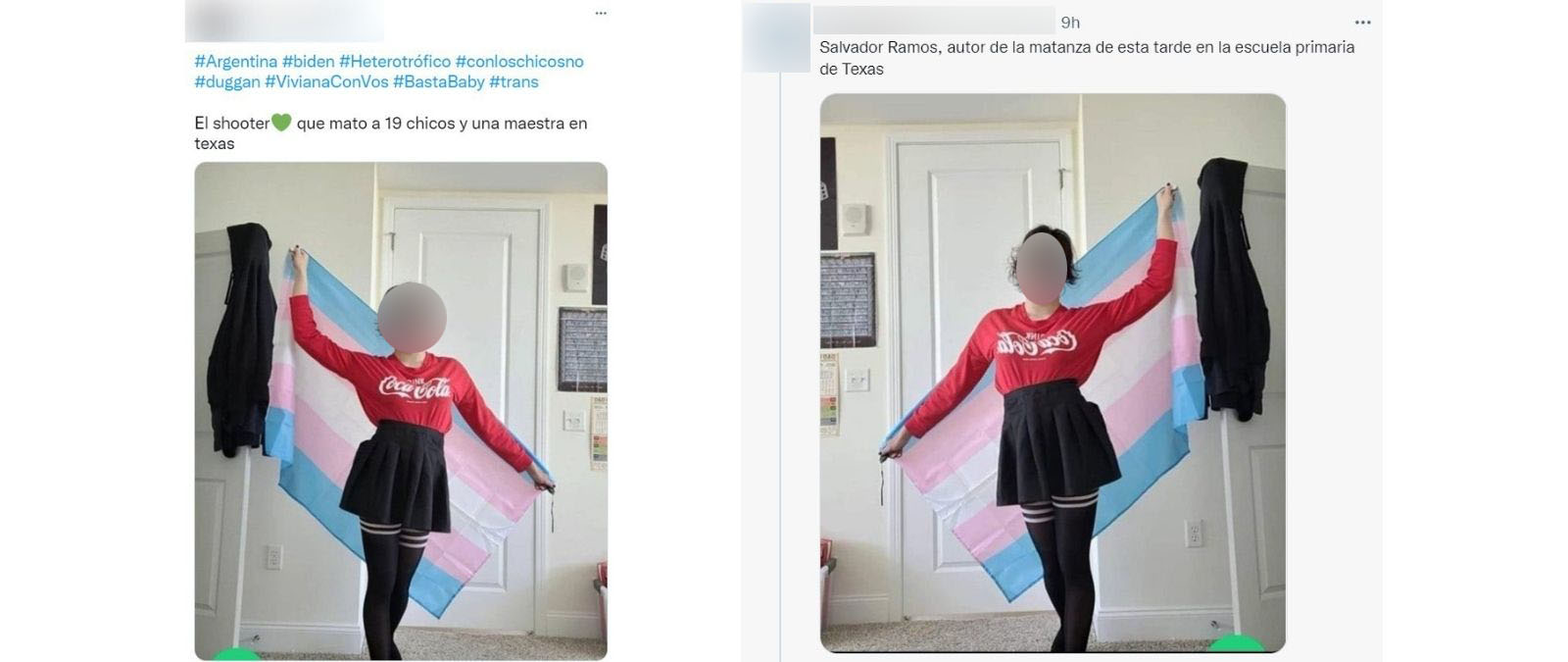 Aunque su imagen se ha difundido en varios medios de comunicación, también se están compartiendo otras fotografías en redes sociales, como Twitter o Reddit, que aseguran que Ramos era un chico trans. “El shooter que mató a 19 chicos y una maestra en Texas”, se puede leer en un tuit acompañado de una foto con una persona sujetando la bandera trans.