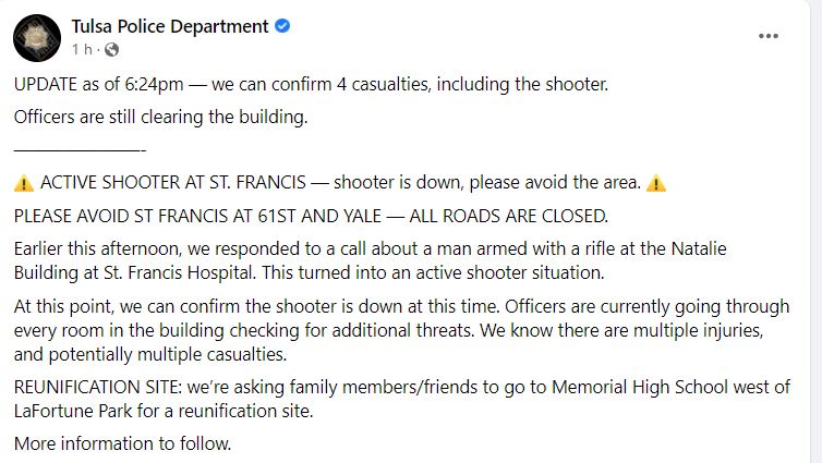 Desafortunadamente, a las 19:15 horas, el Departamento de Policía de Tulsa informó que el número de víctimas por el tiroteo en el hospital de Tulsa había aumentado a cinco.