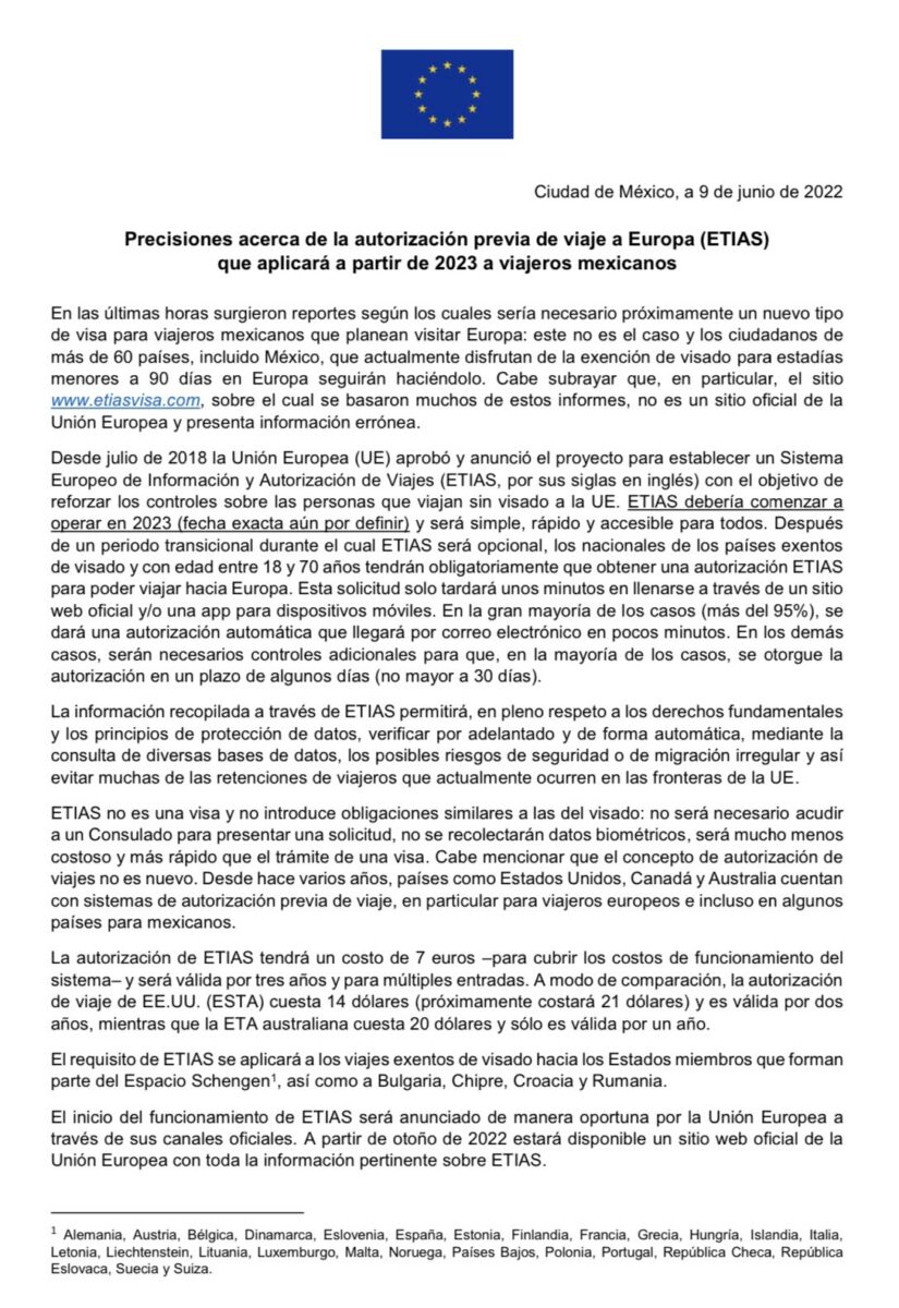 Los ciudadanos de más de 60 países, incluido México, disfrutan de la exención de visado para estadías menores a 90 días en Europa y seguirán haciéndolo. De igual forma, afirmó que la página web etiasvisa.com no es un sitio oficial de la Unión Europea y contiene información con errores.