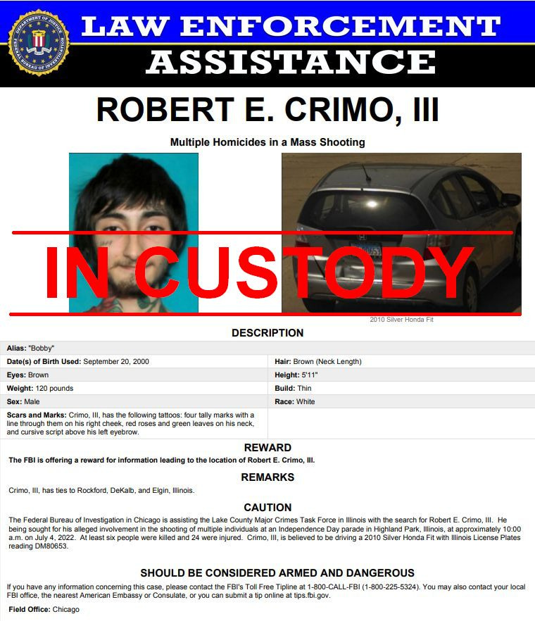 El mismo día del ataque, sobre las 6:30 PM aproximadamente (hora local), el departamento de Policía del Norte de Chicago detuvo a una persona sospechosa de este asesinato, a la que se identificó como Robert (Bobby) E. Crimo III, según indica un comunicado de la ciudad de Highland Park.