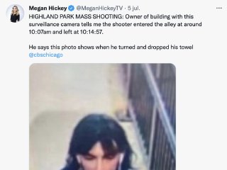 Sobre la supuesta imagen del detenido que está circulando en la que se ve a una persona con pelo largo y negro y un teléfono celular en la mano, la periodista de la cadena de televisión estadounidense CBS Chicago Megan Hickey afirmó a través de su cuenta de Twitter que el propietario del edificio donde se encuentra supuestamente la cámara de vigilancia desde donde se tomó esta fotografía aseguró “que el tirador ingresó al callejón alrededor de las 10:07 am y se fue a las 10:14:57”, y que la foto “muestra cuando él se dio la vuelta y se le cayó la toalla”. Desde Factchequeado no se ha podido verificar de manera independiente que la persona de la imagen sea el detenido Robert E. Crimo III.