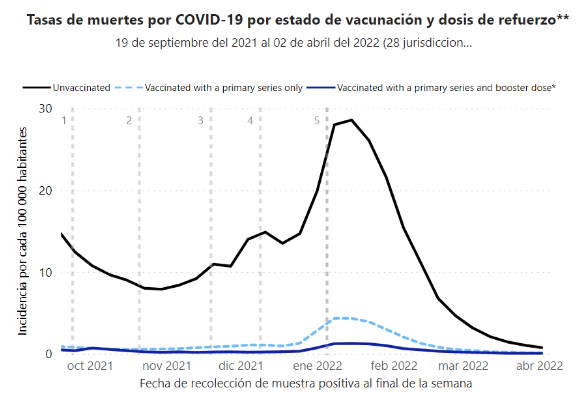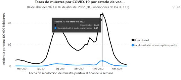 Este rastreador de los CDC permite ver cómo ha oscilado la tasa de muertes por covid-19 por cada 100 mil habitantes, según el estado de vacunación. En enero de 2022, fallecían 24.14 habitantes por cada 100 mil entre personas no vacunadas, en comparación con las 2.47 muertes por cada 100 mil entre los vacunados con al menos el esquema completo (sin ningún booster).