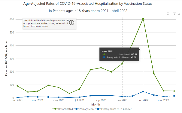 En el peor momento, enero 2022, la tasa entre personas no vacunadas era de 607.65 hospitalizaciones por cada 100 mil personas, mientras que entre vacunados con al menos una dosis de refuerzo era de 47.75 por cada 100 mil.