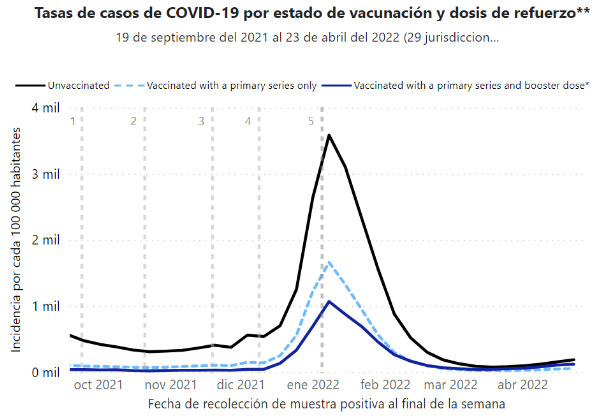 El rastreador de los CDC refleja que la tasa de casos de covid-19 por cada 100 mil habitantes siempre ha sido superior entre la población no vacunada que en la vacunada. No obstante, la cifra de riesgo de dar positivo por covid es bastante menor que en muerte y hospitalización. Para junio de 2022, un no vacunado tenía 2.3 veces más riesgo de contraer covid-19 que un vacunado con dosis de refuerzo.