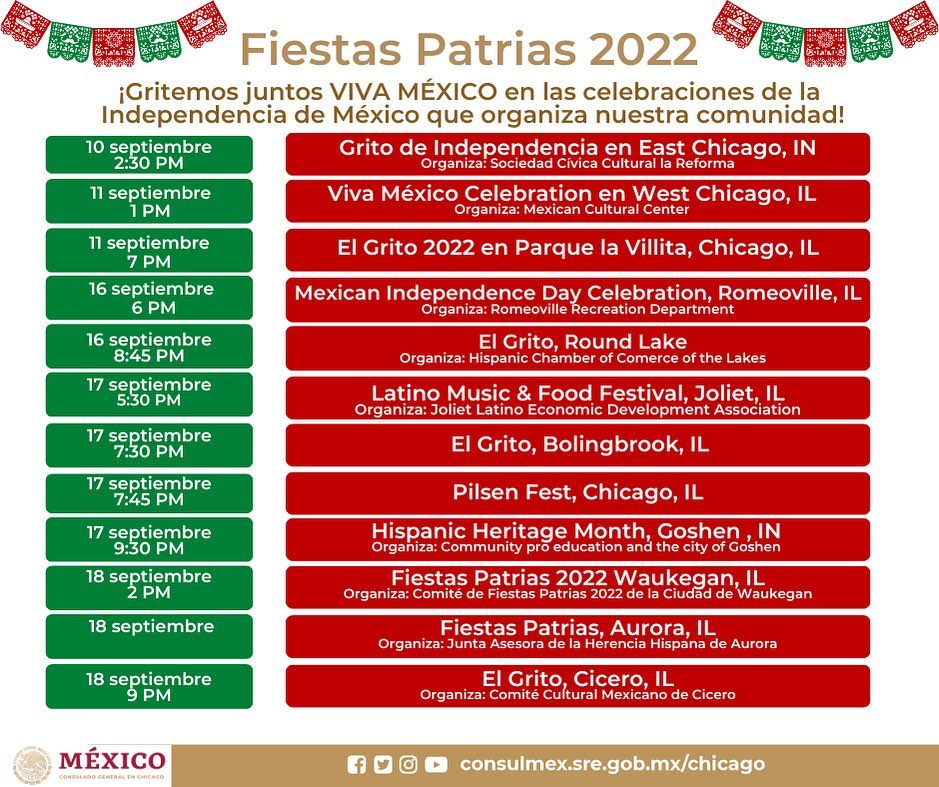 Por otro lado, el Hispanic Chamber of Commerce of the Lakes te invita a El Grito Round Lake; la cita es a las 8:45 pm.