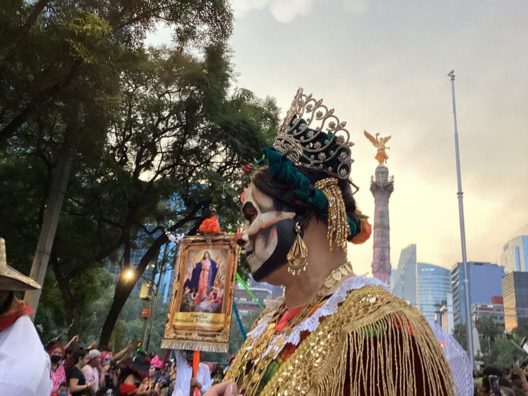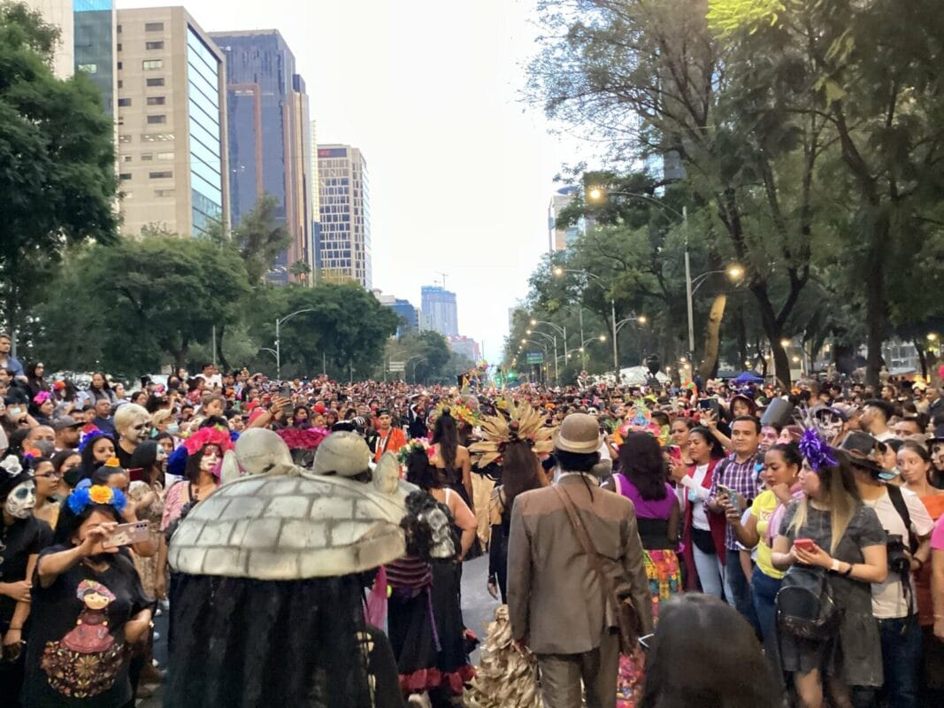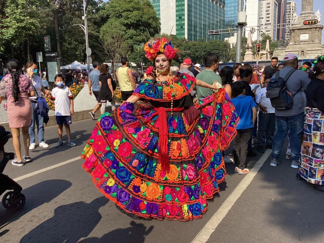 Sombreros, diademas de flores de colores, rostros blancos con ojos negros que simulaban un cráneo llenaron los casi 5 kilómetros entre el Ángel de la Independencia y el Zócalo Capitalino.