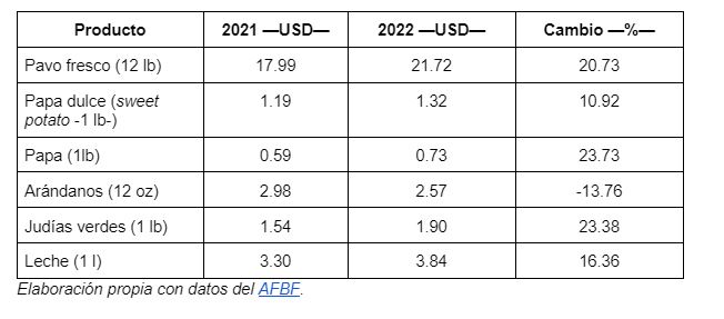 Por otro lado, la Federación de la Oficina Agrícola Estadounidense (AFBF, del inglés American Farm Bureau Federation) maneja otras cifras. De acuerdo con los datos publicados por tal organización, que conglomera al sector de los agricultores y ganaderos del país, una cena de Acción de Gracias preparada con los productos a los que hace referencia el USDA será un 16.27% más cara que en 2021.